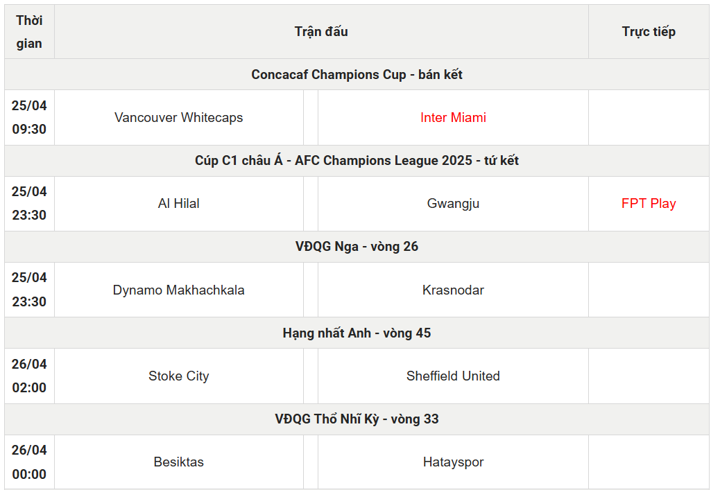 LỊCH THI ĐẤU BÓNG ĐÁ NGÀY 27/4/2025